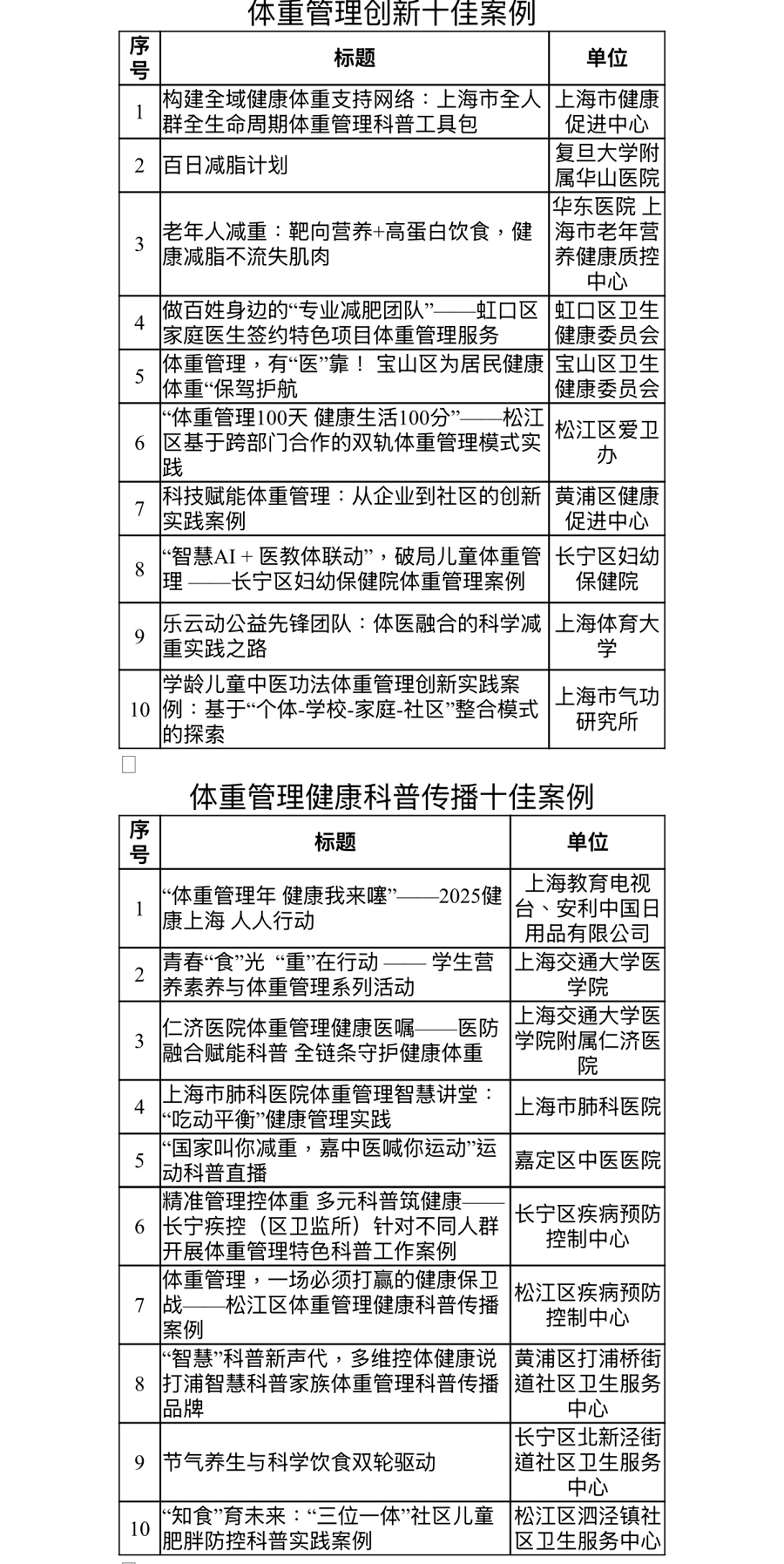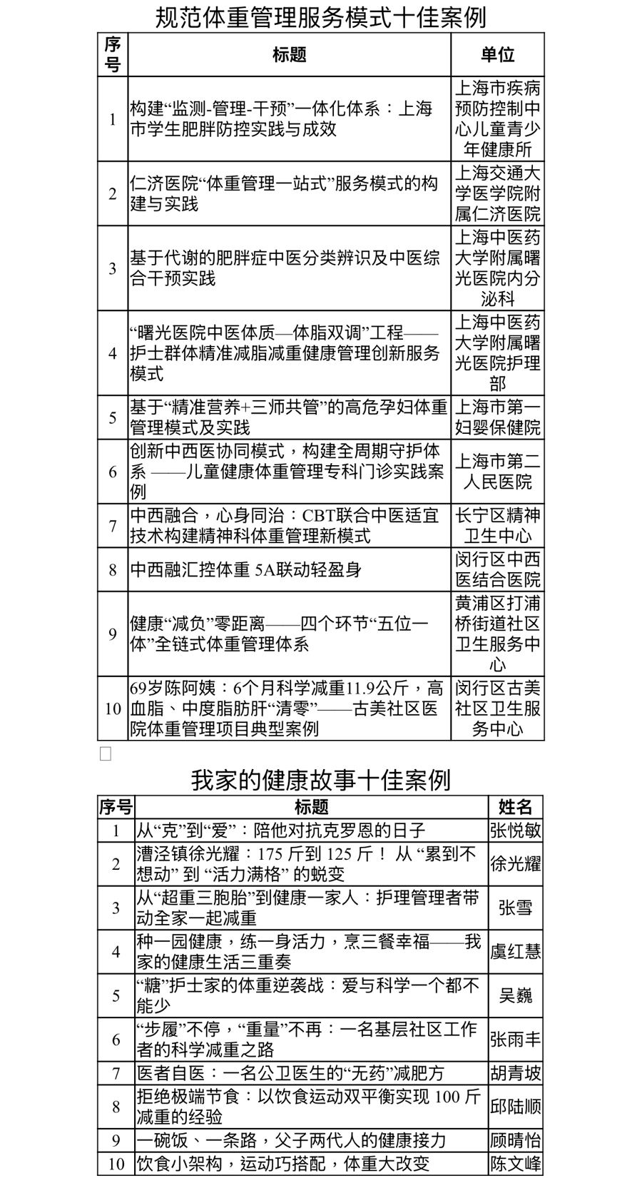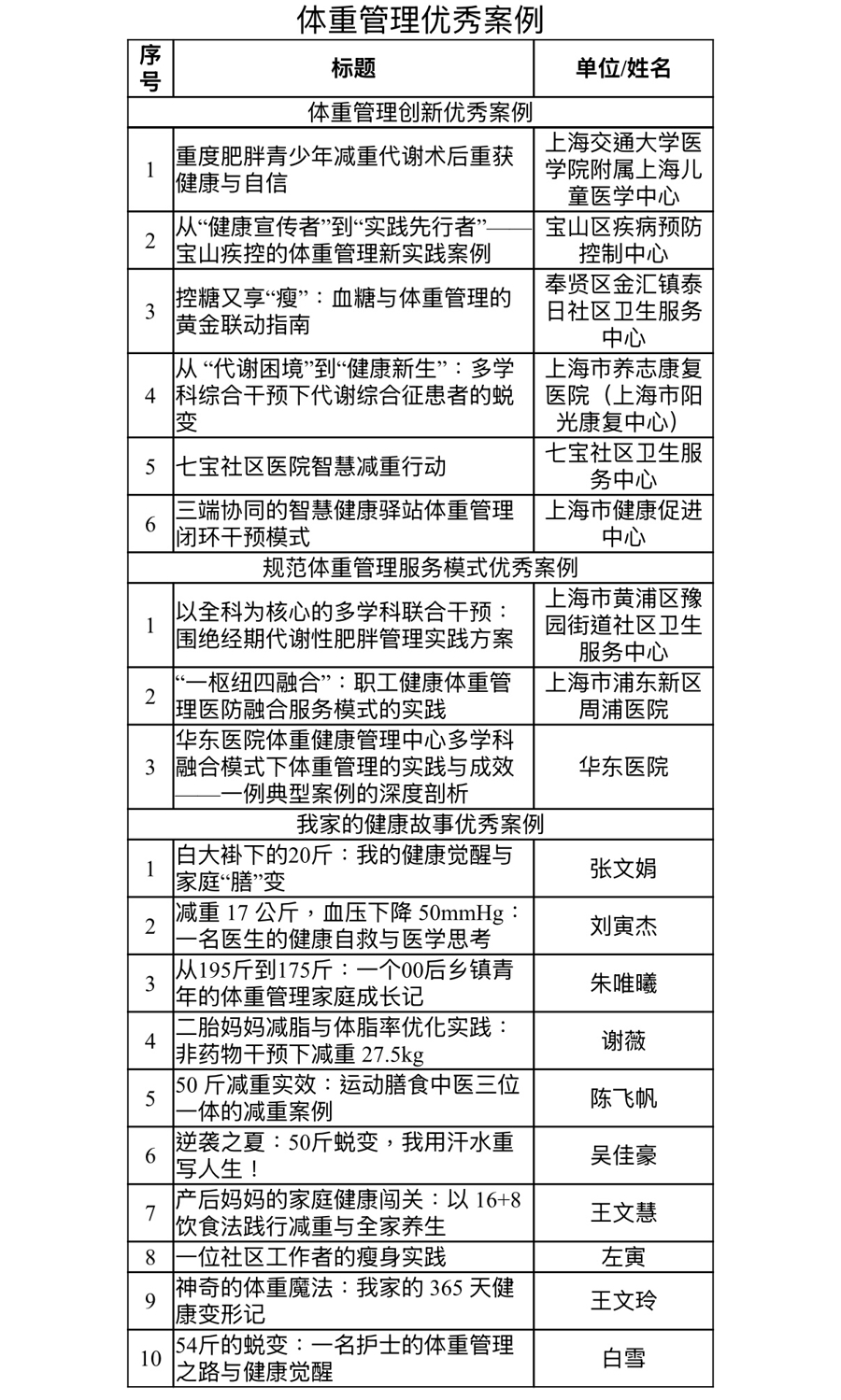 记者从市爱卫办获悉,正值冬春季爱国卫生运动开展之际,本市体重管理案例征集推选活动结果正式揭晓——“体重管理创新十佳案例”“体重管理健康科普传播十佳案例”“规范体重管理服务模式十佳案例”“‘我家的健康故事’十佳案例”与若干优秀案例等,共同推动体重管理行动,传播健康理念,普及健康知识,倡导健康生活方式,营造良好的社会支持环境,深化爱国卫生运动与健康上海行动。